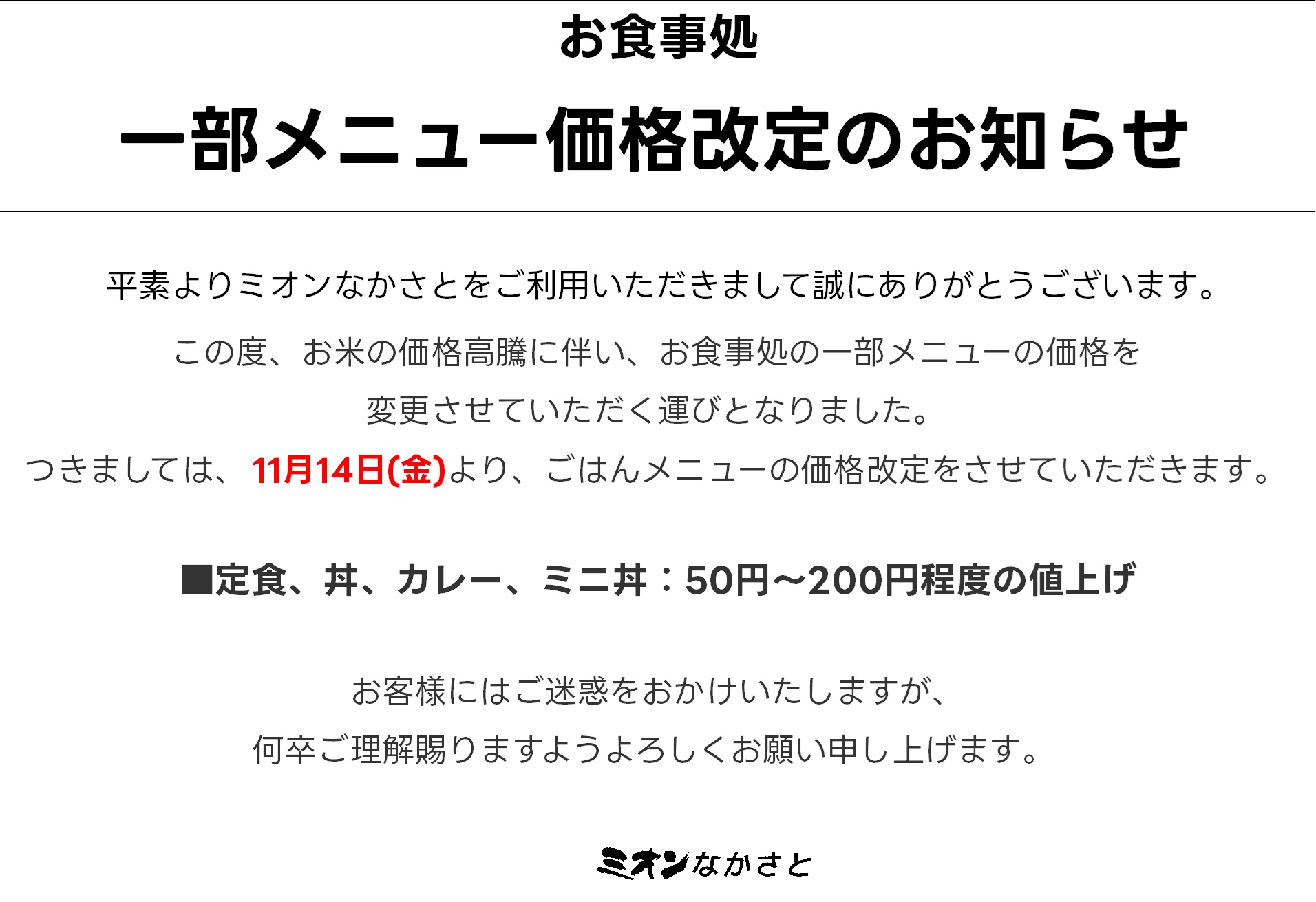 ■2025.11.5お食事処一部メニュー価格改定のお知らせ
