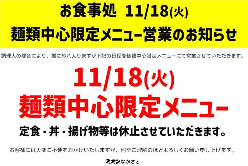 11/18(火)は『麺類中心限定メニュー』にて営業させていただきます。