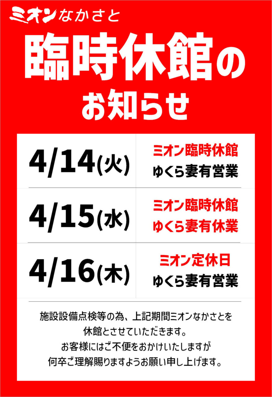 【臨時休館】2026/4/14(火)・15(水)・16(木)の3日間